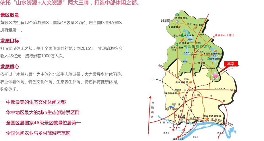 项目位于华中最大旅游集群的门户位置,区位优势明显,距武汉中心城区38公里,距天河机场28公里、距武